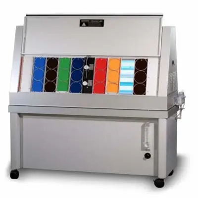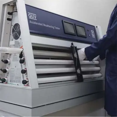 The QUV tester accurately simulates environmental damage factors to predict how materials will perform when exposed to outdoor conditions.