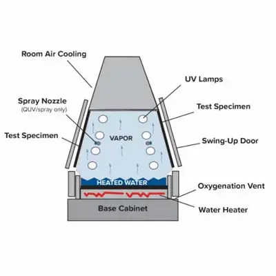 - UV Radiation: Uses fluorescent lamps to precisely replicate the short-wave UV region of solar spectrum – the primary cause of photodegradation in outdoor materials